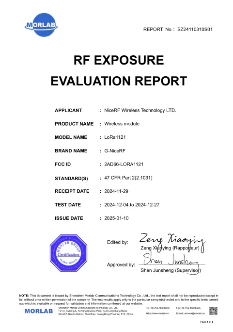 Complete certification report. Click to view the detailed attachment of LoRa1121.