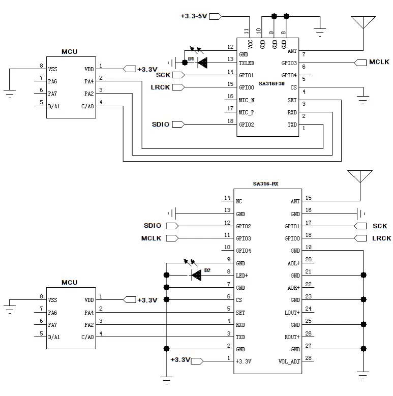 The SA316S series products are divided into transmitter modules SA316S-TX, SA316F30, and receiver module SA316S-RX. This series uses a wireless high-quality voice transmission chip for its design. It can support external PCM / IIS dual-mode digital audio interfaces, and provides customers with a standardized serial interface. Users can quickly and easily set the module's transceiver frequency, volume, microphone gain, and other parameters through serial port commands, which is widely used in situations that require high sound quality.
